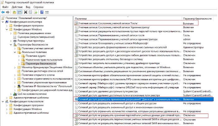 Учетные записи: Состояние учётной записи ‘Гость’ (Accounts: Guest Account Status): Включен (Enabled);