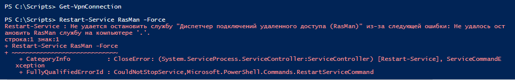 При попытке перезапустить службу диспетчера подключений удалённого доступа стандартной командой возникает ошибка: